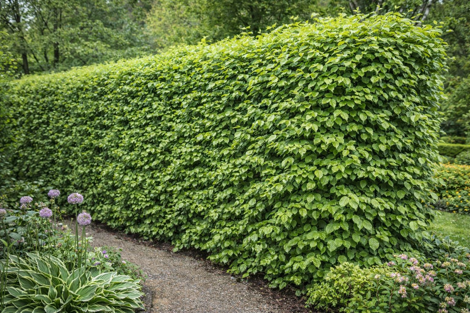 Sa croissance vigoureuse permet d’atteindre rapidement une hauteur et une densité suffisantes pour créer un écran à la fois visuel et acoustique. Son feuillage vert profond reste constant toute l’année, y compris durant les hivers rigoureux, ce qui garantit une protection continue quelle que soit la saison. Rustique et peu exigeant une fois installé, c’est l’un des arbustes de haie les plus fiables que l’on puisse planter.