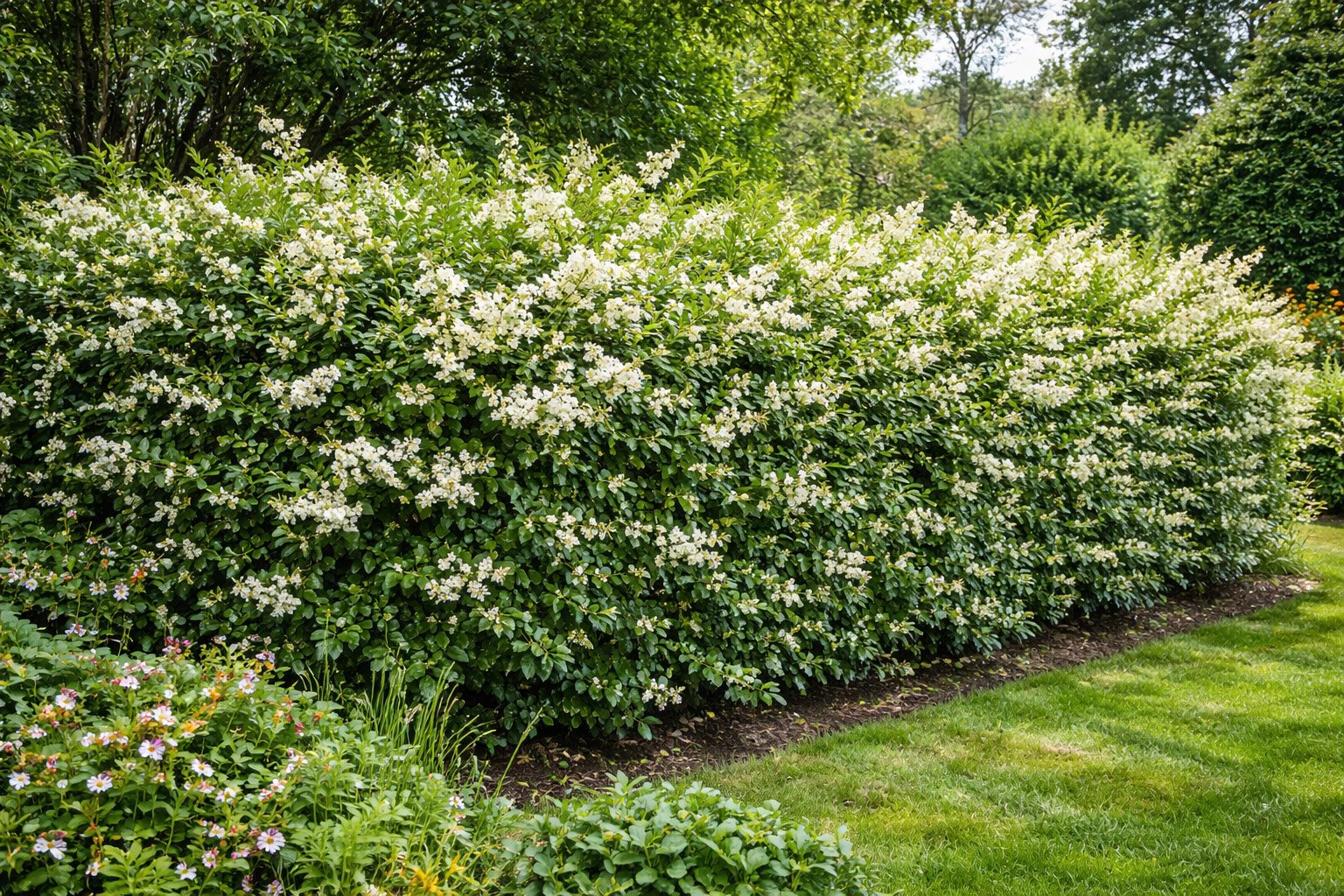 Il réserve également une surprise que l’on ne voit pas venir : en automne, une floraison minuscule et presque invisible dégage un parfum intense rappelant le jasmin. C’est l’un de ces détails qui transforment une haie fonctionnelle en expérience sensorielle à part entière.